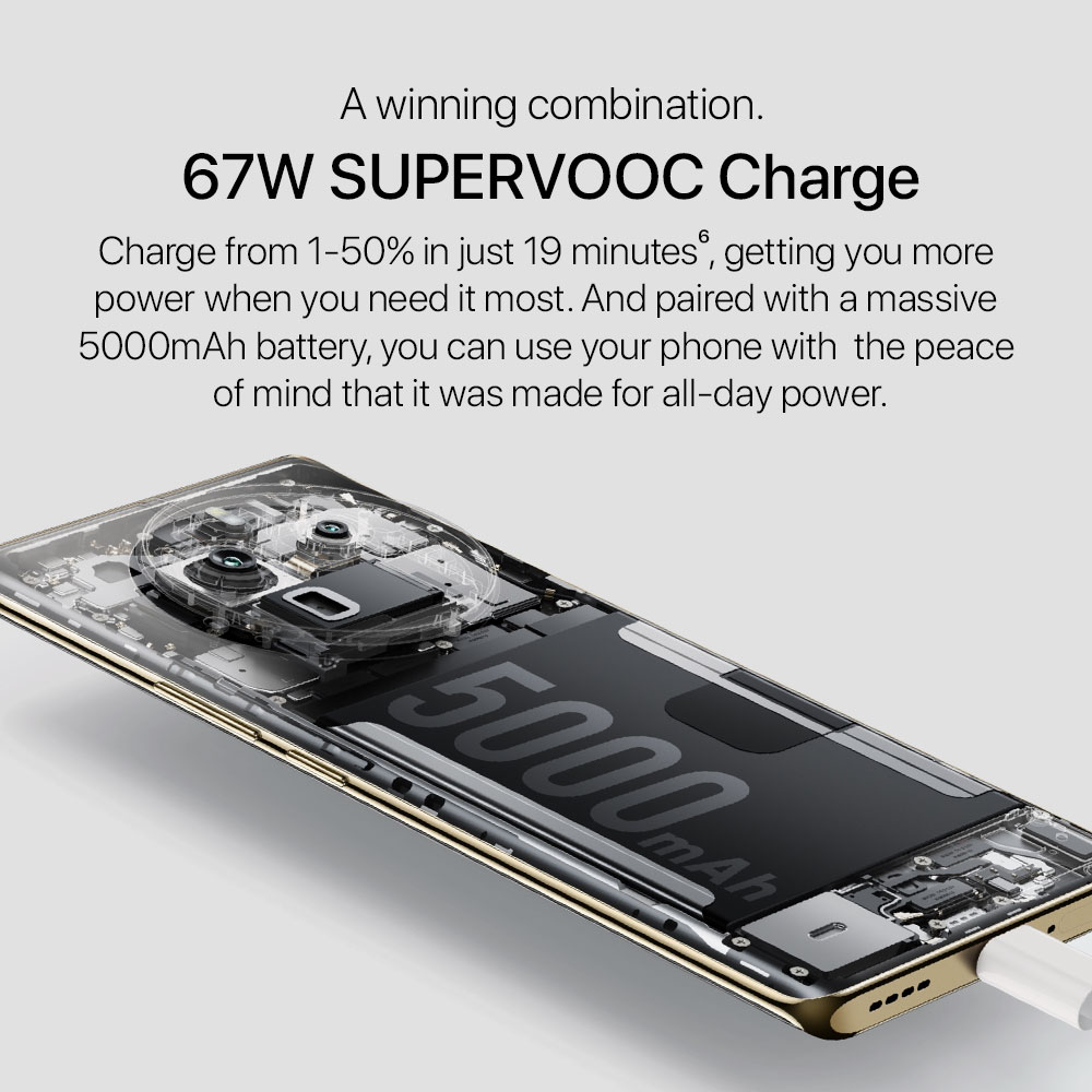 - Battery: 5000mAh (typ) Massive Battery | 67W SUPERVOOC Charge