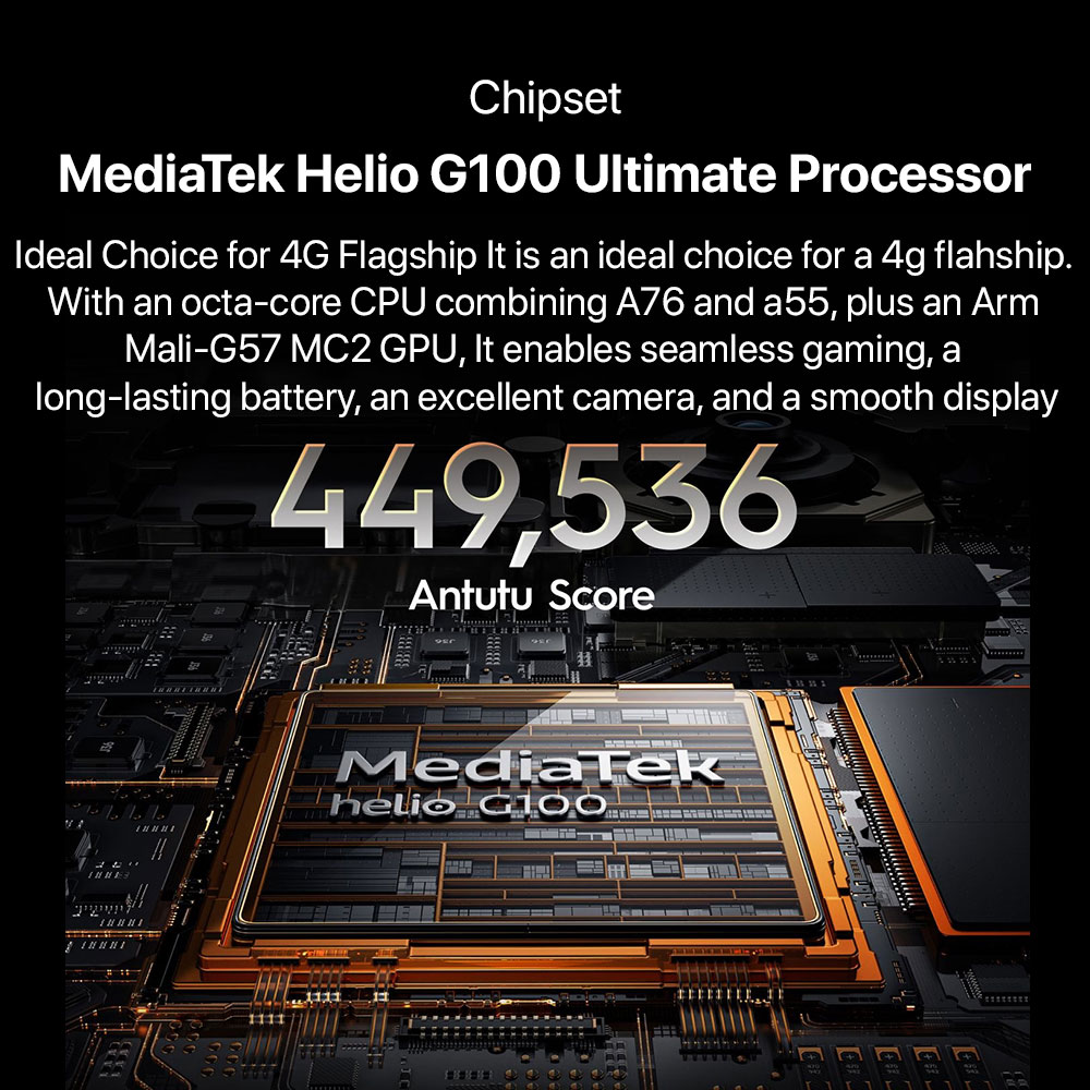 - Chip: MediaTek Helio G100 Ultimate
